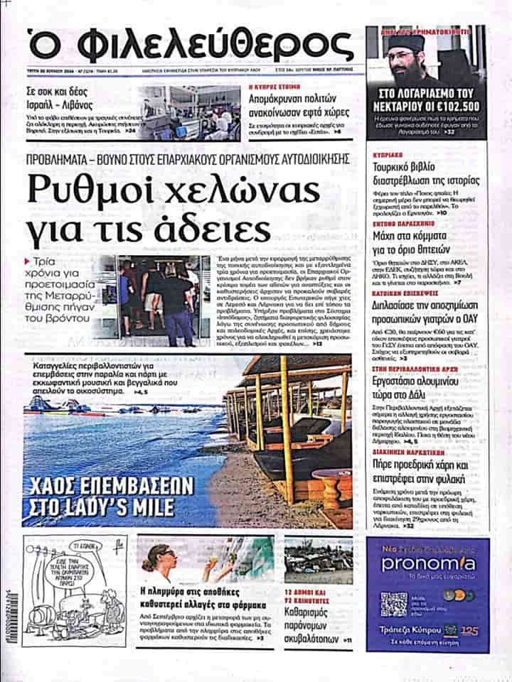 FİLELEFTEROS “İzinler için kaplumbağa hızında” başlığını çektiği bugünkü manşetinde, yerel yönetimlerle ilgili reformların uygulanmaya başlamasından bir ay sonra İl Yönetim Kuruluşlarının kalkınma ile ilgili izinlerde bir ritim tutturamadığını ve yapılan ertelemelerin artık büyük tepki ve itirazlara neden olmaya başladığını aktarıyor.