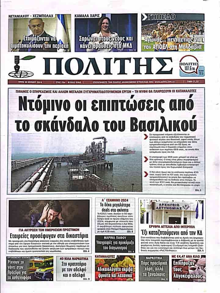 POLİTİS “Vasiliko skandalının domino etkileri” başlıklı manşetinde, Vasiliko’daki doğalgaz sıvılaştırma terminali inşası ile ilgili yaşanan skandalın sonuçlarının adeta bir domino etkisi yaratmaya başladığını ve sıvılaştırma terminali inşası ile ilgili anlaşmalarda sürekli olarak sorun yaşanmasından, AB tarafından finanse edilen diğer projelerin de etkilenmesinin beklendiğini aktarıyor.