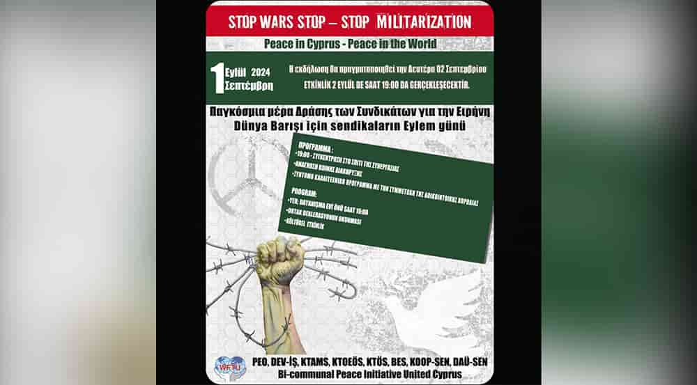 Dünya Sendikalar Federasyonu (WFTU) üyesi PEO, DEV-İŞ, KTAMS, KTÖS, KTOEÖS, BES, KOOP-SEN, DAÜ-SEN ve İki Toplumlu Barış İnisiyatifi-Birleşik Kıbrıs, Küresel Barış için Sendikaların Eylem Günü 1 Eylül’ü, bu yıl 2 Eylül Pazartesi akşamı Dayanışma Evi önünde kutlayacak.
