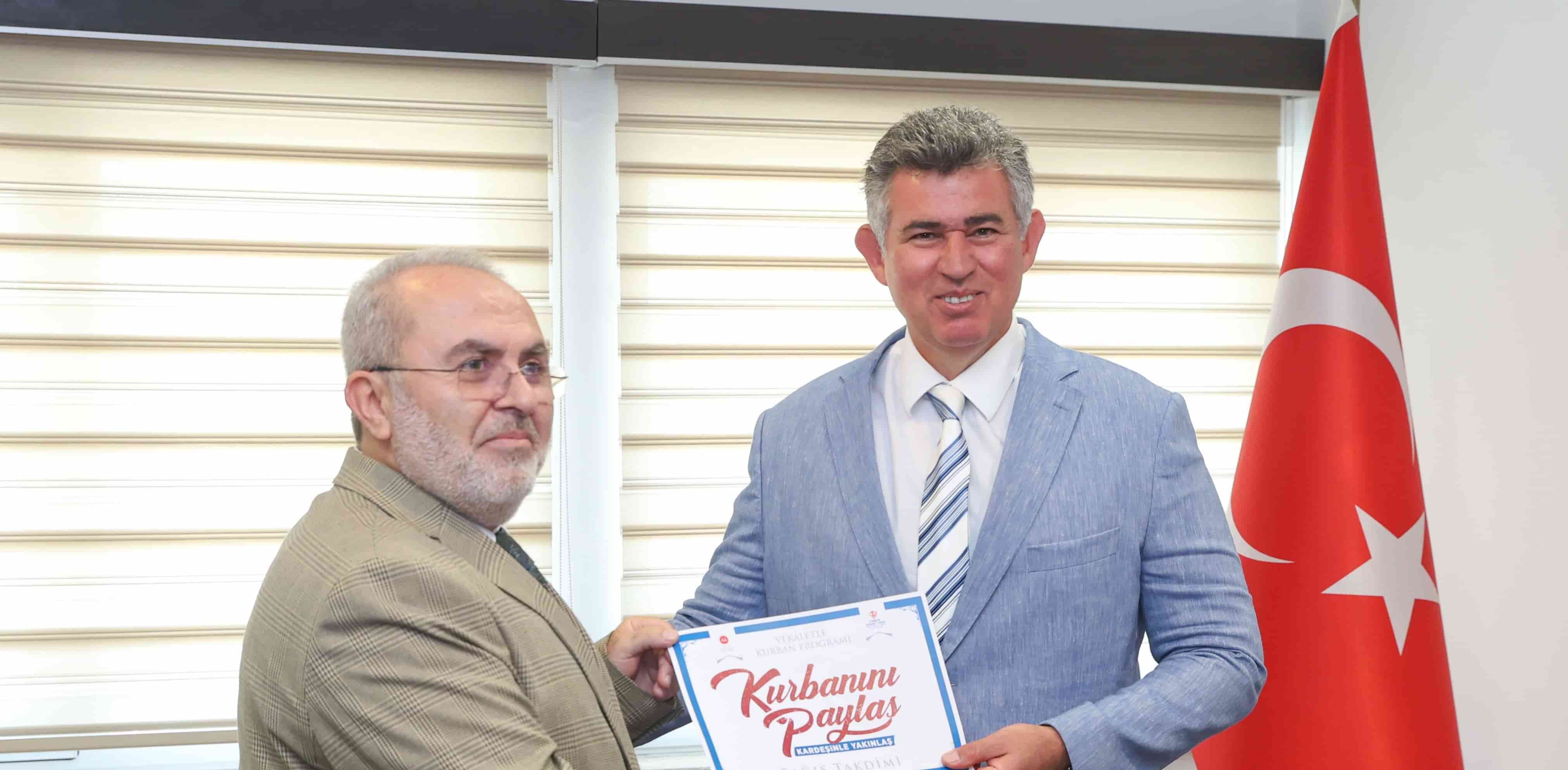 Kendisi ve ailesinin kurbanlarını, ihtiyaç sahiplerine ulaştırılmak üzere TDV’ye bağışlayan Feyzioğlu’na Boşal tarafından “bağış takdim belgesi” verildi.