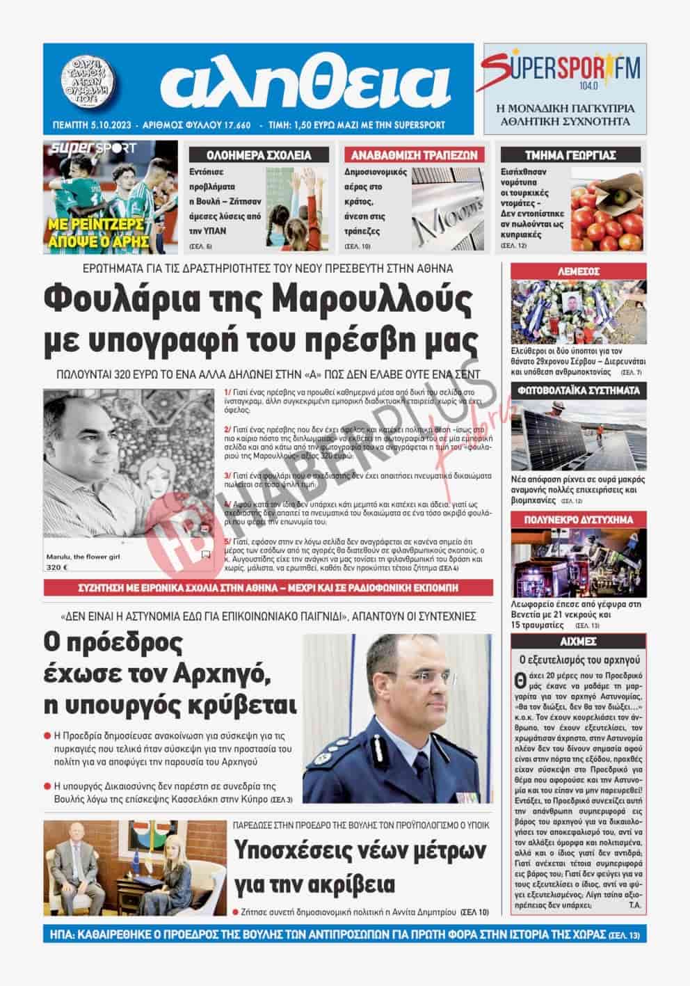 ALİTHİYA, “Büyükelçimiz imzası ile Marullus’un fularları” başlığı ile aktardığı manşet haberinde fularların bir tanesinin 320 euroya satıldığına ancak gazeteye yaptığı açıklamada kendisinin bir sent bile almadığını söylediğine ve yeni büyükelçinin Atina’daki faaliyetlerinin merak konusu olduğuna değiniyor.