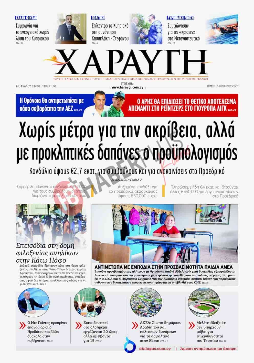 HARAVGİ, manşetten paylaştığı haberinde “Pahalılık için önlem alınmadan, bütçede kışkırtıcı harcamalar” başlığını kullanarak Rum Başkanlık Sarayı’nın restorasyonu için ve Rum Lider’in danışmanları için 2,7 milyon euroluk ödenek/fon ayrıldığına değiniyor.