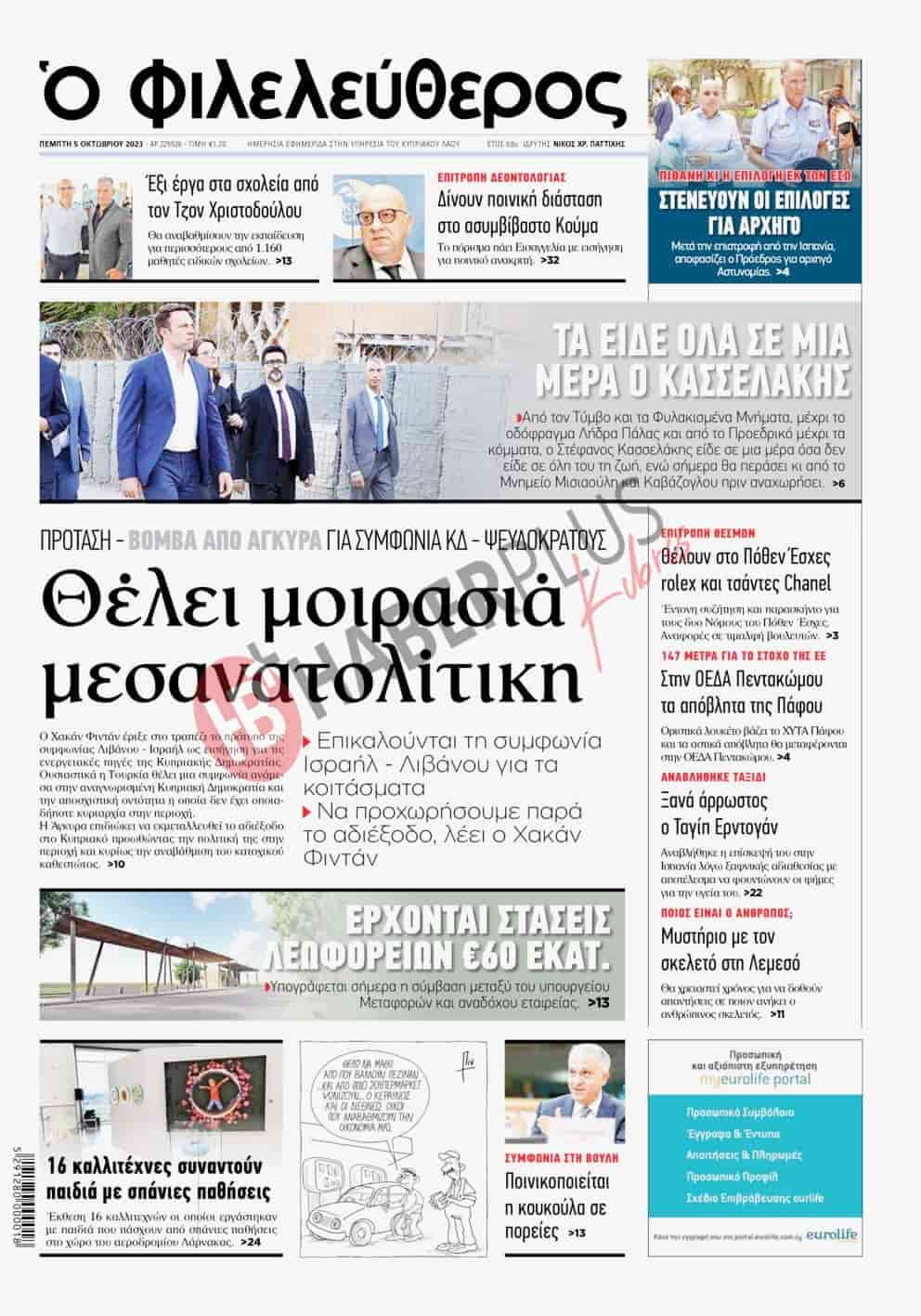 FİLELEFTHEROS, bugün manşetten aktardığı haberinde Ankara’dan KKTC ile Kıbrıs Cumhuriyeti arasında bir anlaşma olması için bomba gibi bir öneri geldiğine, rezervler için İsrail-Lübnan anlaşmasına atıfta bulunulduğuna ve Türkiye Dışişleri Bakanı Hakan Fidan’ın bu çıkmaza rağmen ilerleyeceklerini söylediğine değiniyor.