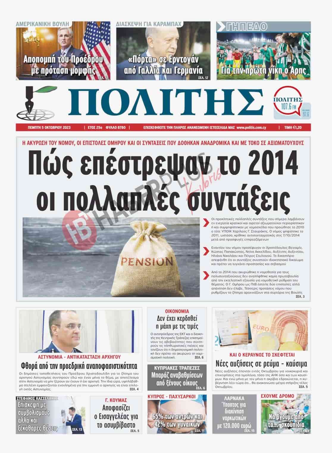 POLİTİS, “Çoklu emeklilikler 2014 yılına nasıl döndü” başlığını kullandığı manşet haberinde yasanın geçersiz sayılması ile bugün aktif devlet yetkilileri ve seçilmiş yetkililer tarafından alınan kışkırtıcı emeklilik maaşları ile ilgili, 2010 yılında o dönemin Rum Maliye Bakanı Harilaos Stevrakis tarafından sunulan bir yasa tasarısı ile sınırlandırılıp dengelendiğine, yasanın 2011 yılında onaylandığına ancak bundan etkilenenlerin itirazları sonrası 7 Ekim 2014 yılında anayasaya aykırı olduğuna karar verildiğine değiniyor.