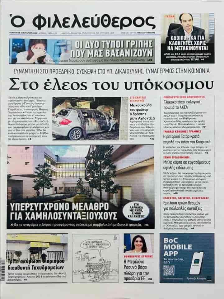 FİLELEFTEROS manşetten aktardığı haberinde “Yeraltı dünyasının insafına kaldılar” başlığını kullanarak Güney Kıbrıs’ta artan olaylar nedeni ile Rum Başkanlık Sarayı’nda toplantı yapıldığına, Rum Adalet Bakanlığında bilgilendirme yapıldığına ve kamunun alarmda olduğuna değiniyor.