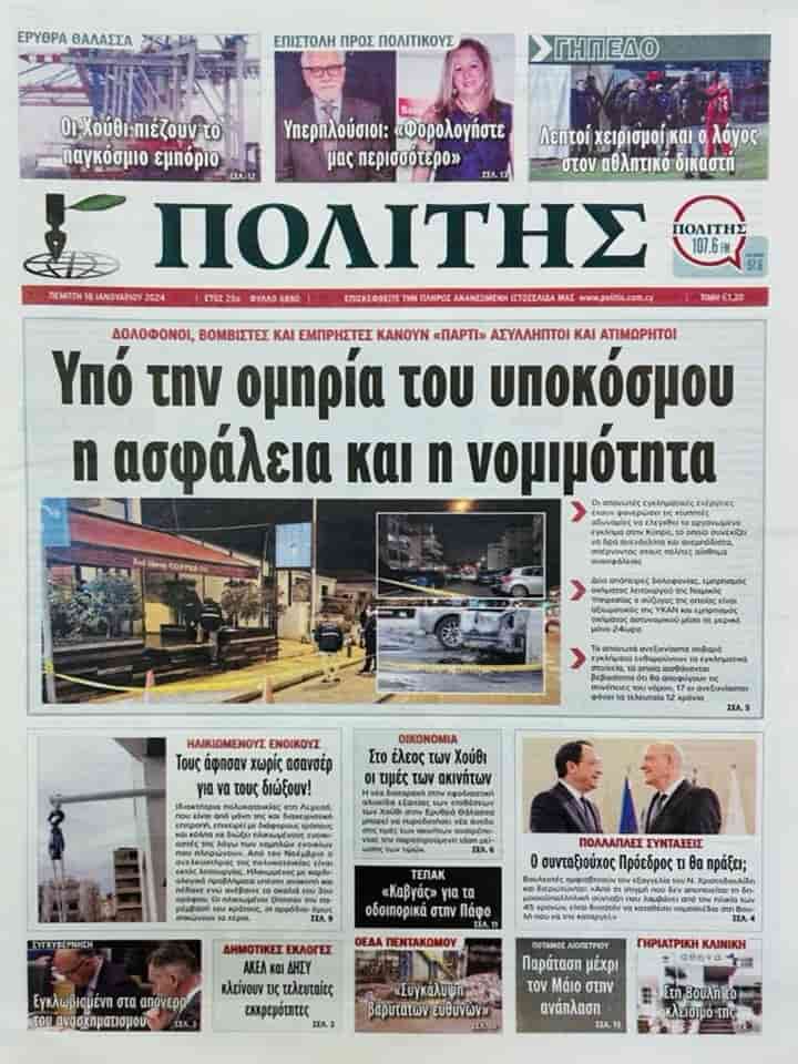 POLİTİS “Güvenlik ve yasallık yeraltı dünyası tarafından rehin alındı” başlığını kullandığı manşet haberinde Güney Kıbrıs’ta katillerin, bombacıların ve kundakçıların inanılmaz bir şekilde yakalanmadan ve cezalandırılmadan parti yaptıklarına değiniyor.