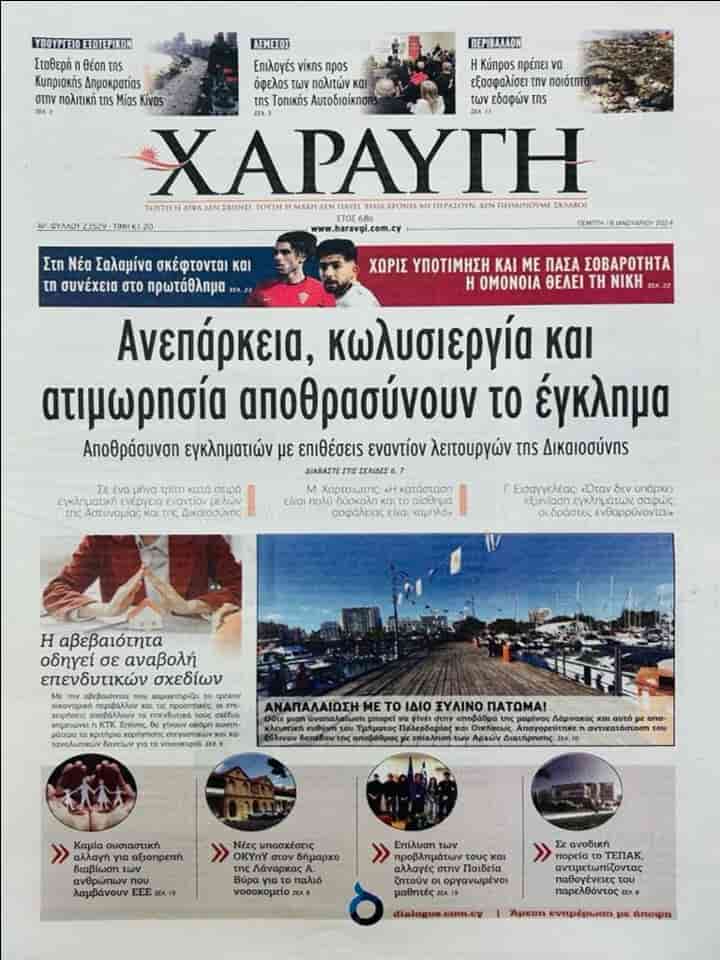 HARAVGİ manşetten paylaştığı haberinde “Yetersizlik, geciktirme ve cezasızlık suça teşvik ediyor” başlığını kullanarak Güney Kıbrıs’ta adalet görevlilerine yapılan saldırılar ile suçlulara yüz verildiğine değiniyor.