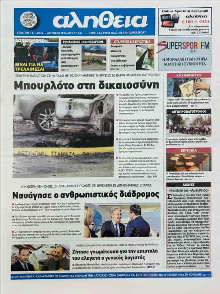 ALİTHİYA “Adalette ateş gemisi” başlığı ile aktardığı manşet haberinde Rum kamu kuruluşlarına yapılan suç eylemleri ile Baf’taki olayın bağlantılı olduğuna değiniyor.