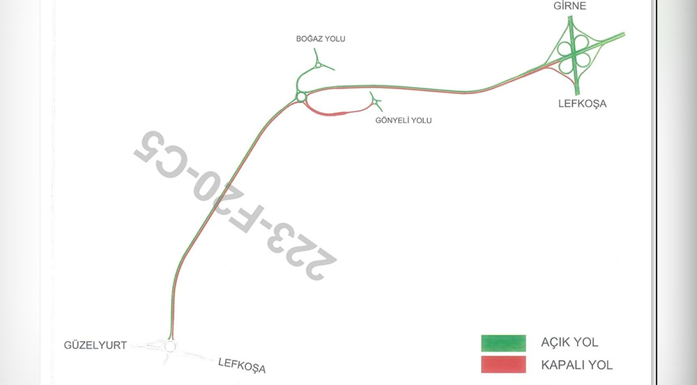 Lefkoşa Kuzey Çevre Yolunun Köprülü Kavşağı ile Alayköy Kavşağı yönü, gidiş güzergahında, yolun krokide gösterilen kesiminin trafiğe tamamen kapatılacağı kaydedilen açıklamada, Gönyeli-Boğaz Yolunun (Eski Gönyeli Yolu) krokide gösterilen kesiminde geliş ve gidiş olmak üzere her iki yönünün de transit geçişlere kapatılacağı bildirildi.
