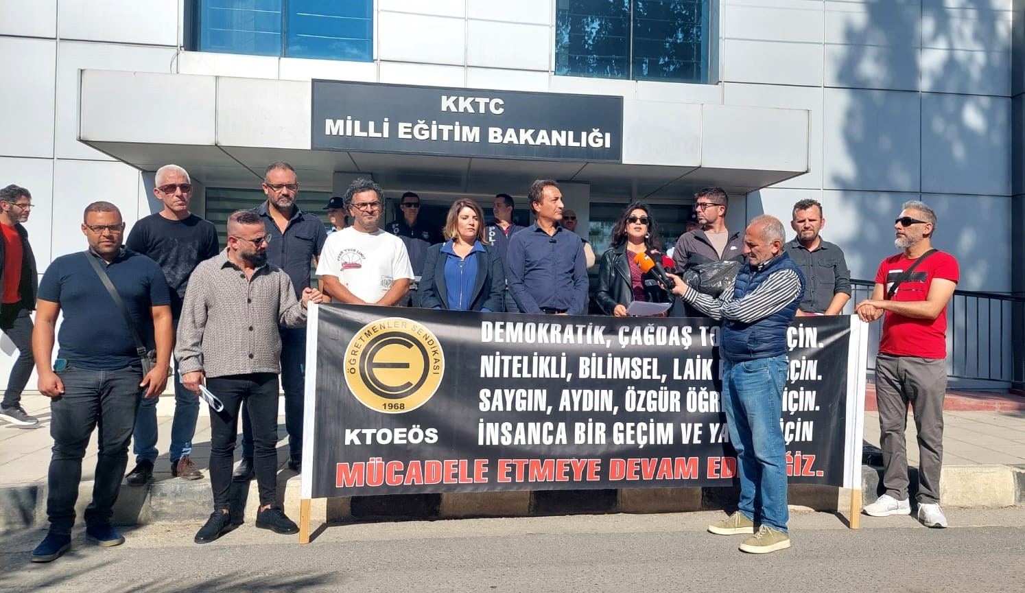 Sendika Yürütme Kurulu üyeleri ve bazı öğretmenlerin katılımıyla yapılan sembolik eylemde KTOEÖS Genel Başkanı Selma Eylem ve Genel Sekreteri Tahir Gökçebel konuşma yaptı.