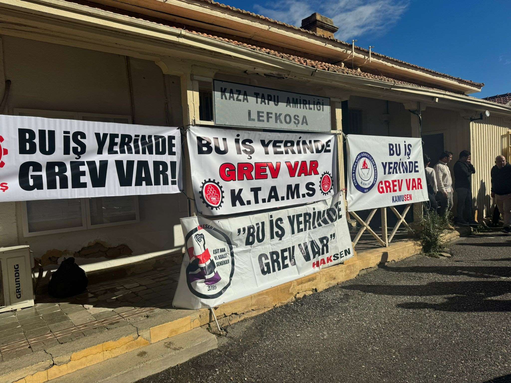 Kıbrıs Türk Amme Memurları Sendikası (KTAMS), Kıbrıs Türk Kamu Görevlileri Sendikası (KAMUSEN), Kamu İşçileri Sendikası (KAMU-İŞ) ve Eşit Hak ve Adalet Sendikası (HAKSEN), dün İçişleri Bakanlığı İskan Müsteşarı ile yaptıkları görüşme sonrasında Lefkoşa Kaza Tapu Amirliği’ndeki grevini 15 Aralık’a kadar askıya aldığını açıkladı.