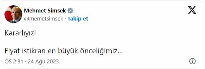 Bakan Şimşek karar sonrası, “Kararlıyız! Fiyat istikrarı en büyük önceliğimiz…” ifadelerini kullandı.