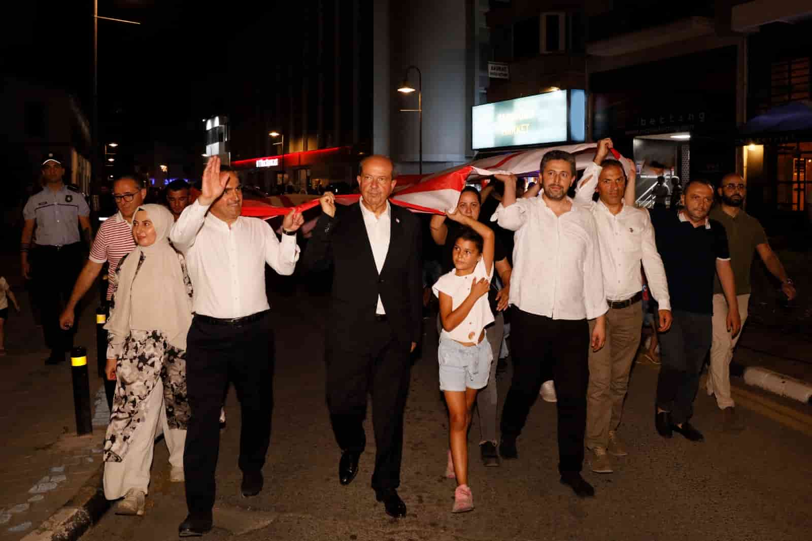 Cumhurbaşkanı Ersin Tatar, Kıbrıs Barış Harekatı’nın 50’nci Yıldönümü Kutlamaları kapsamında Lefkoşa’da Mehteran eşliğinde gerçekleştirilen Bayrak Yürüyüşüne katıldı