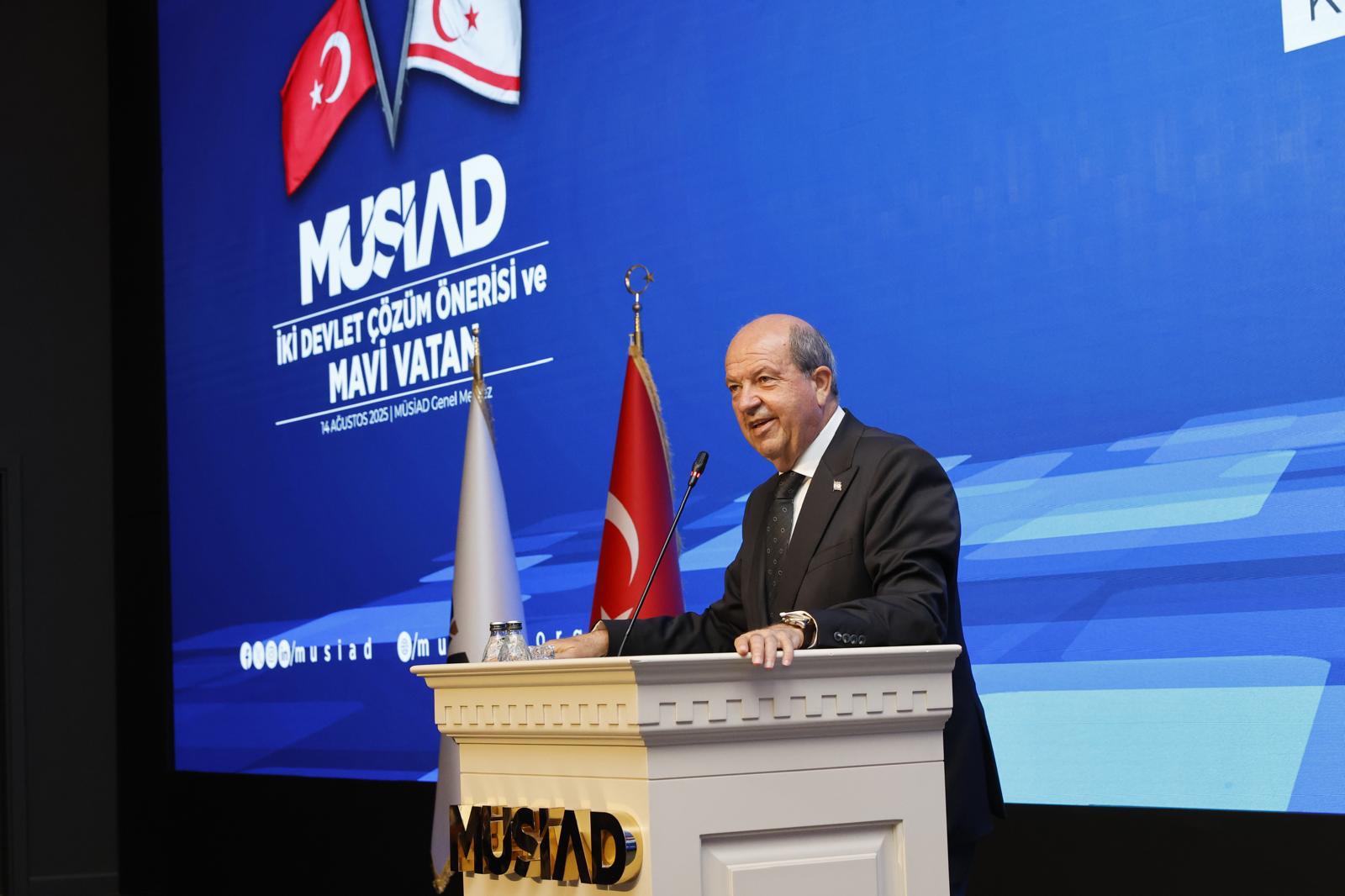 Tatar, Müstakil Sanayici ve İşadamları Derneği’nin (MÜSİAD) ev sahipliğinde düzenlenen “İki Devletli Çözüm Önerisi ve Mavi Vatan” temalı programa katıldı. Cumhurbaşkanlığından yapılan açıklamaya göre, Tatar, MÜSİAD Genel Başkanı Burhan Özdemir ve dernek üyelerinin katılımıyla MÜSİAD Genel Merkezi’nde yapılan programda Kıbrıs meselesi ve Doğu Akdeniz’deki gelişmeler hakkında değerlendirmelerde bulundu.