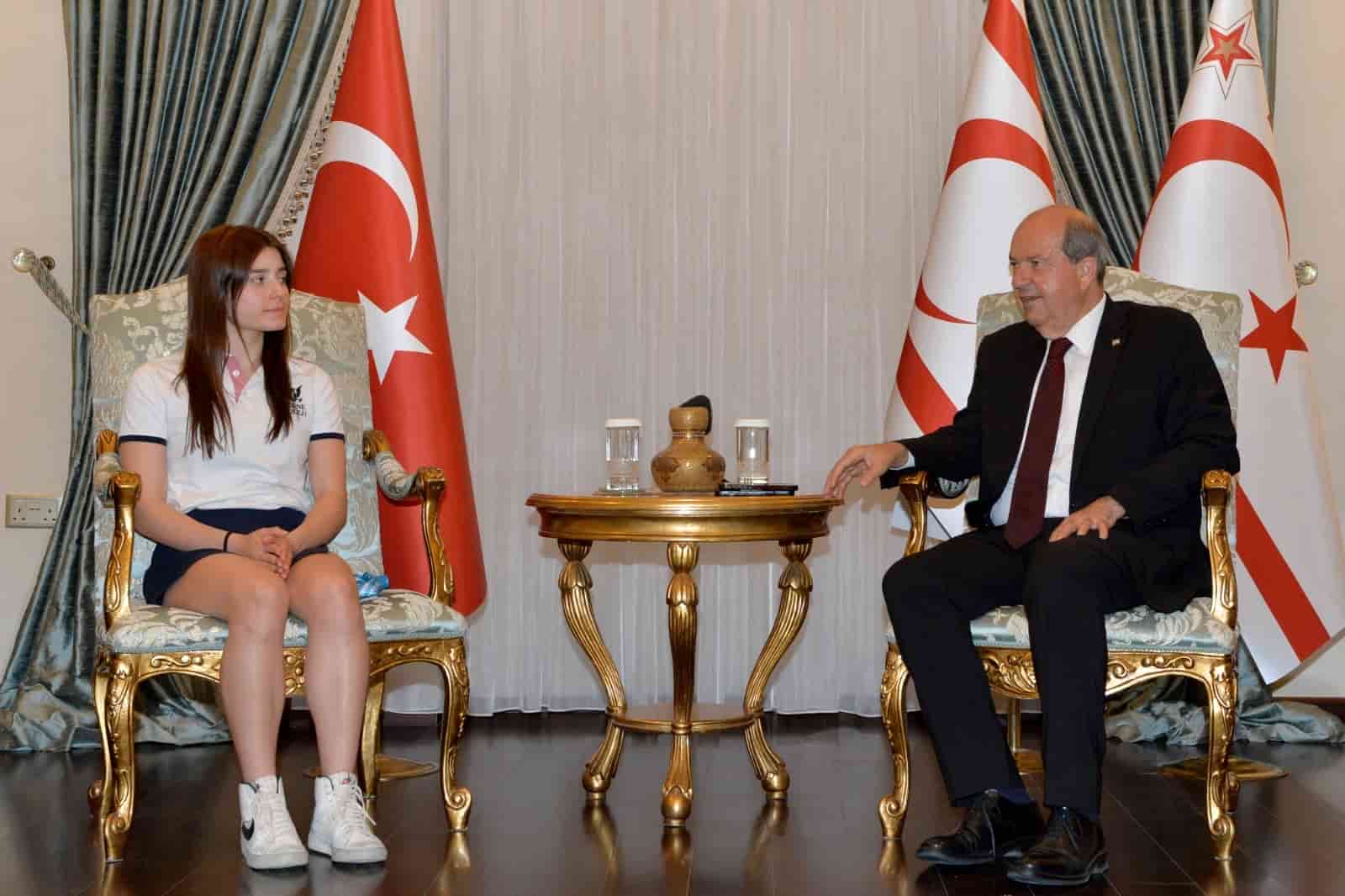 Cumhurbaşkanı Ersin Tatar, Türkiye Yüzme milli takımıyla Bulgaristan’da düzenlenen yüzme yarışlarında başarı elde eden Kıbrıslı Türk yüzücü Özgül Çetin’i kabul etti.