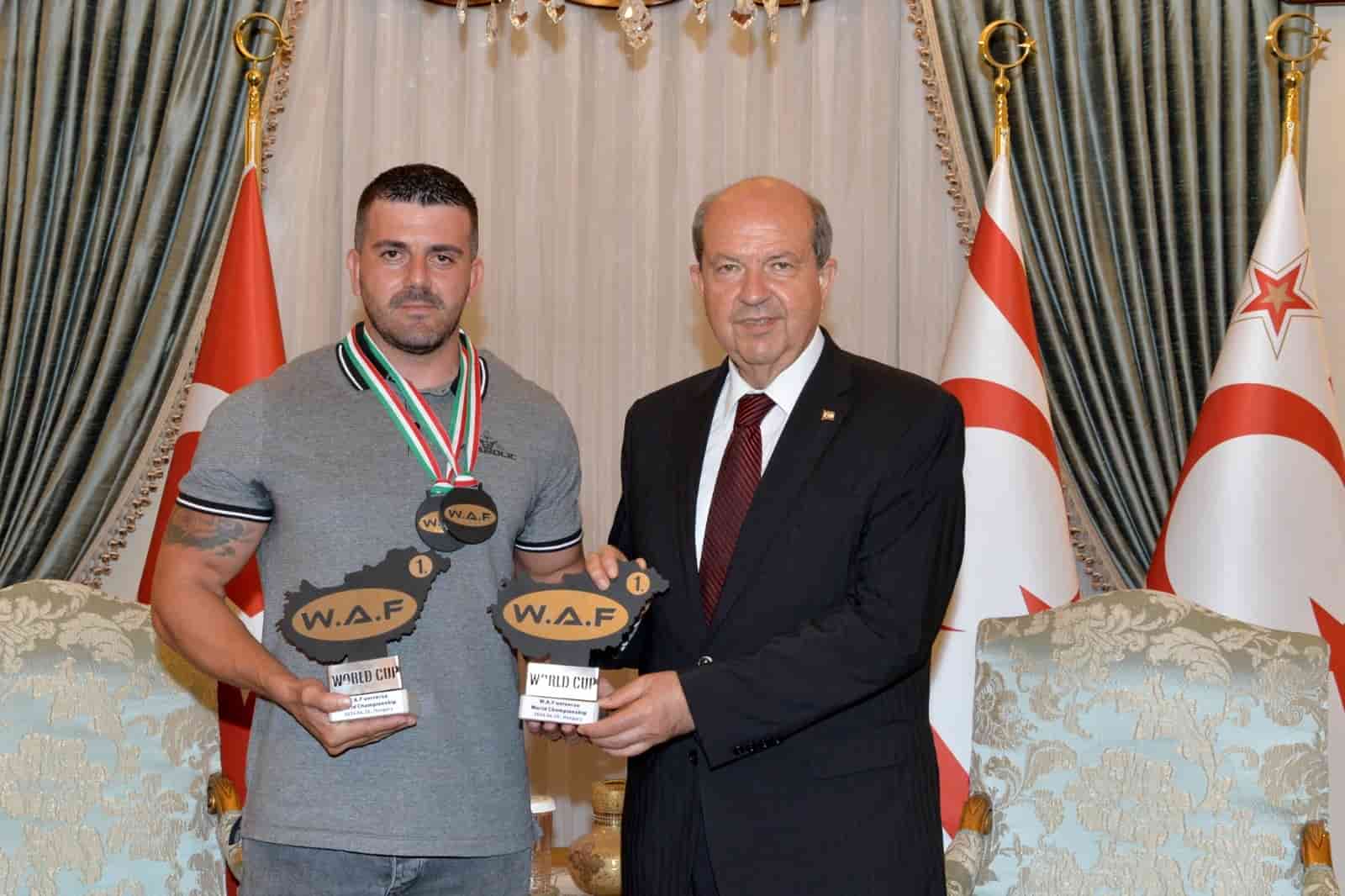 Cumhurbaşkanı Ersin Tatar, W.A.F. UNIVERSE Vücut Geliştirme ve Fitness Dünya Şampiyonası’nda iki farklı kategoride şampiyonluk elde eden Salahi Avcı ve beraberindeki heyeti kabul etti.