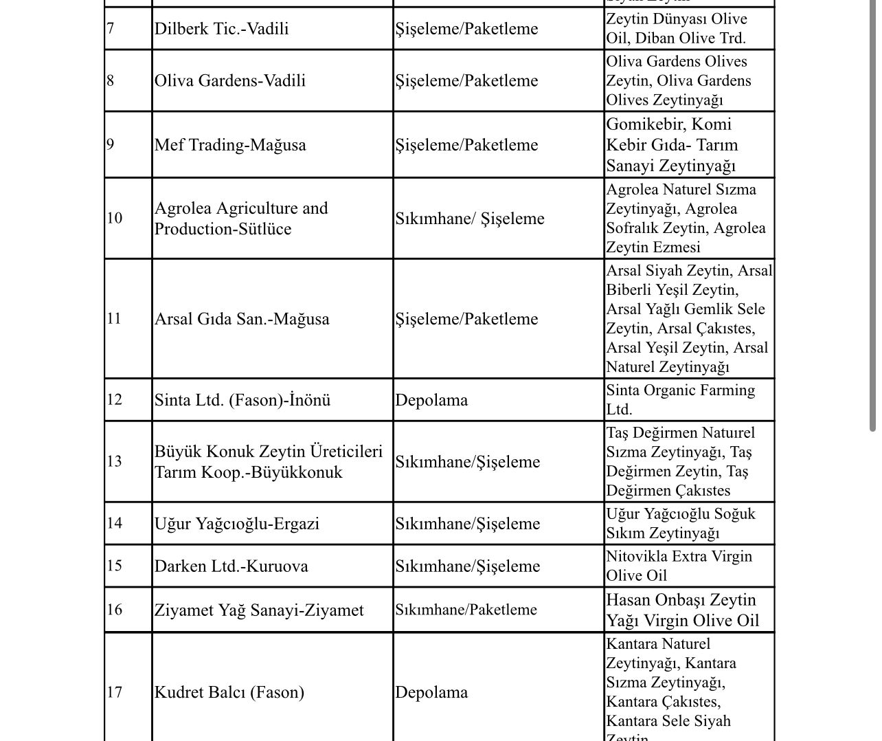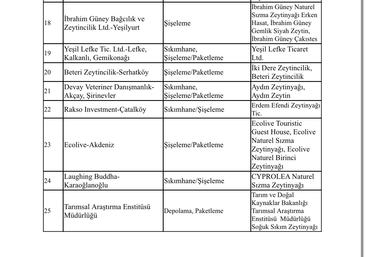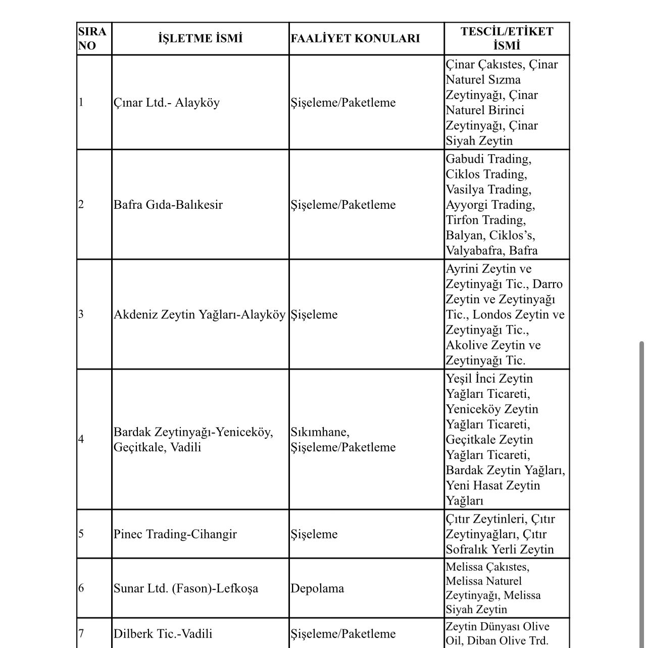 Bakanlık yayınladığı duyuruyla, “7 Temmuz 2023’te yürürlüğe giren 38/2023 sayılı ‘Zeytin ve Zeytin Ürünleri Yasası’ ve bu yasa kapsamında çıkarılan ‘Zeytin ve Zeytin Ürünlerinin Resmi Kontrolleri ile Kayıt ve Onayına İlişkin Tüzük’ doğrultusunda, zeytin ve zeytin ürünleri işletmeleri artık kayıt ve onay almak zorunda.” ifadelerine yer verdi.